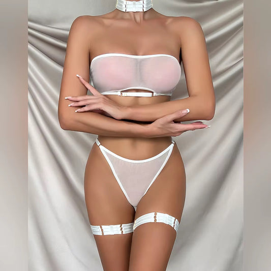 Intimate Electric Blue Sheer Mesh Lingerie Set – Bandeau Bra, Strappy Thong, Choker & Garters