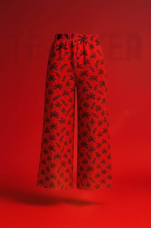 Women’s Red Palm Tree Print Palazzo Pants – Wide-Leg High-Waist Statement Trousers