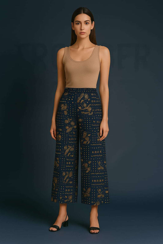 Women’s Navy Blue Palazzo Pants with Golden Palm Print – Wide-Leg High-Waist Trousers