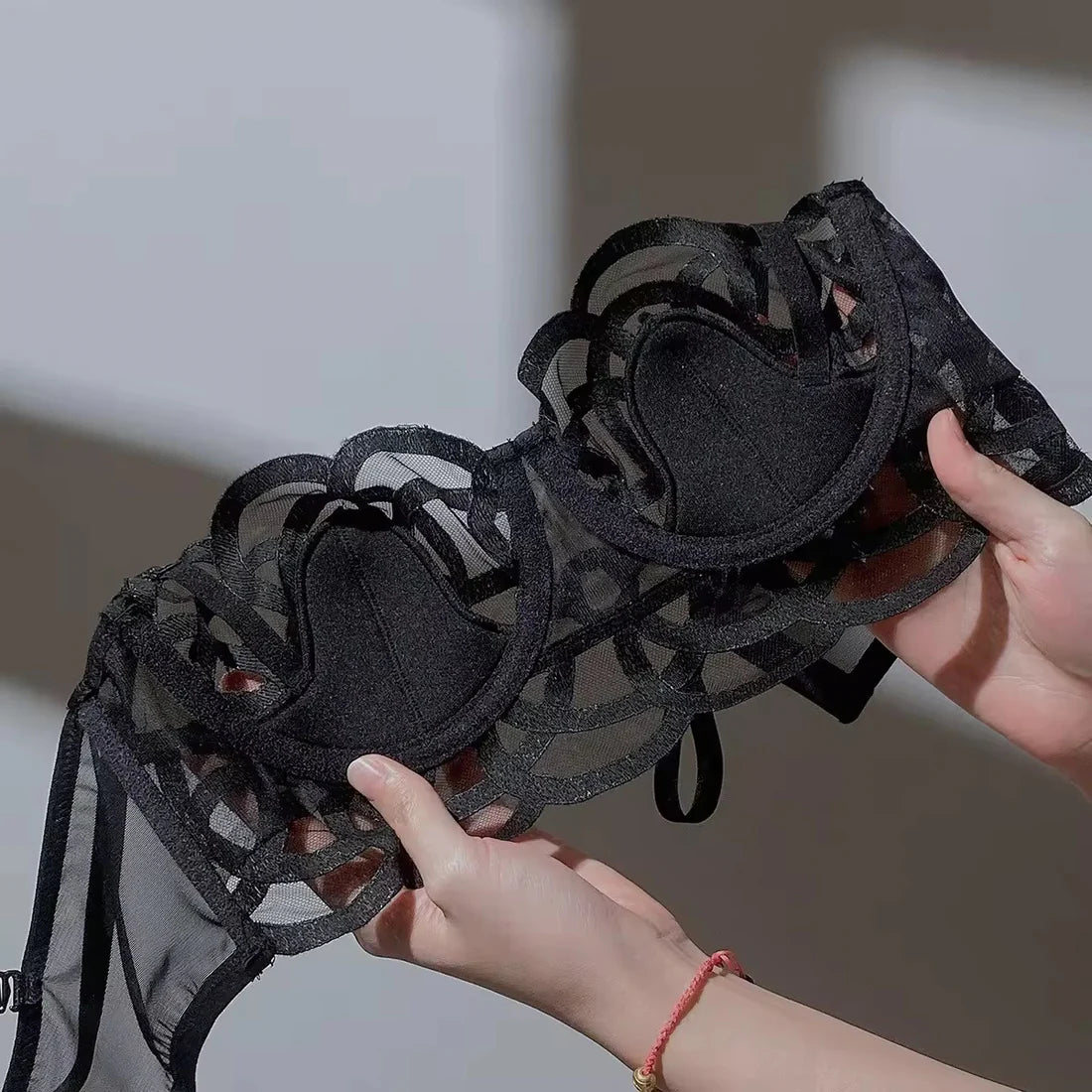 Intimate Transparent Floral Lingerie Set – Black Sheer Bra & Strappy Thong
